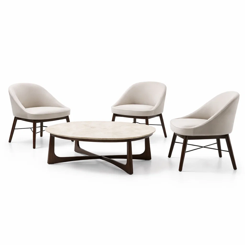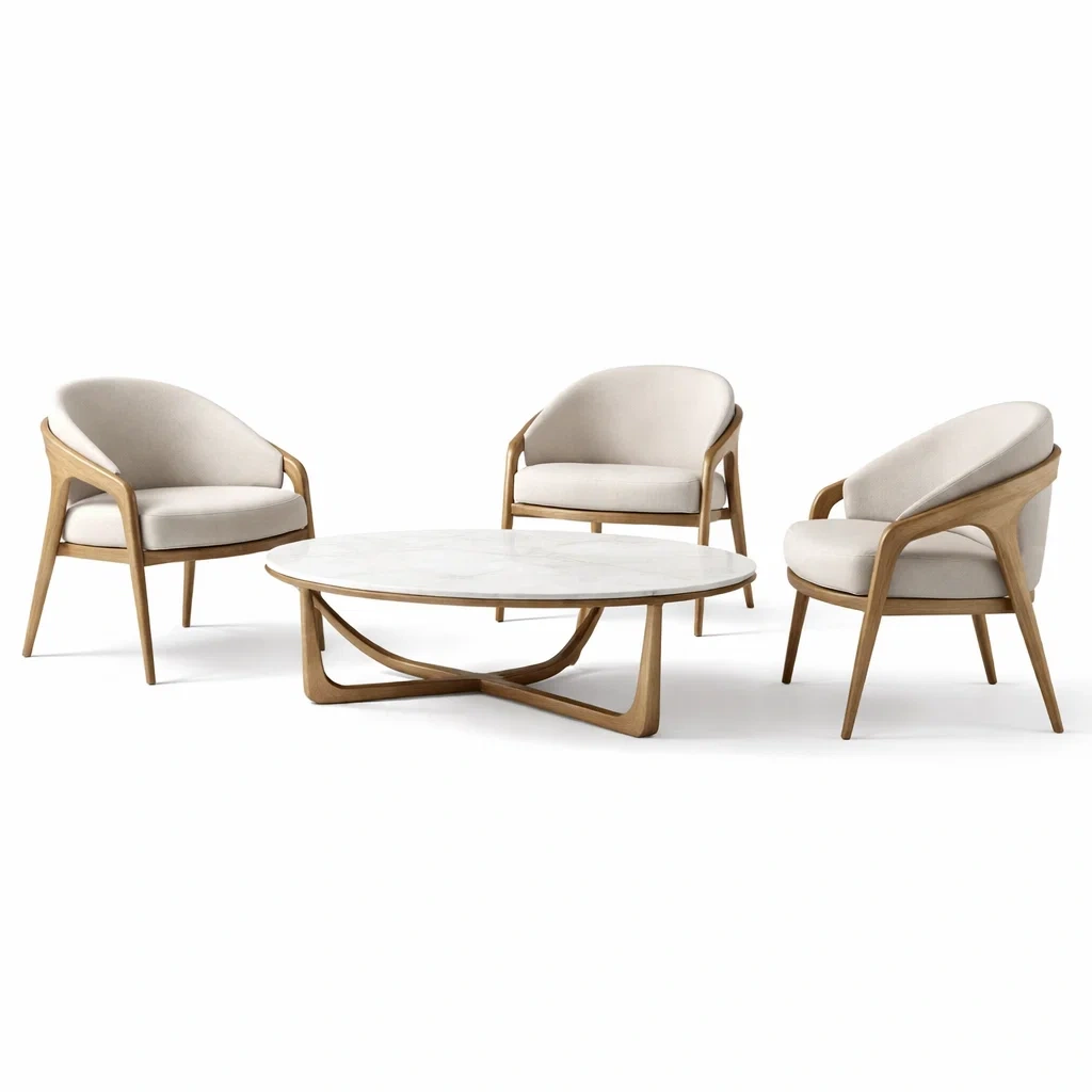 Set da conversazione con tavolino rotondo in marmo e tre poltrone in legno beige