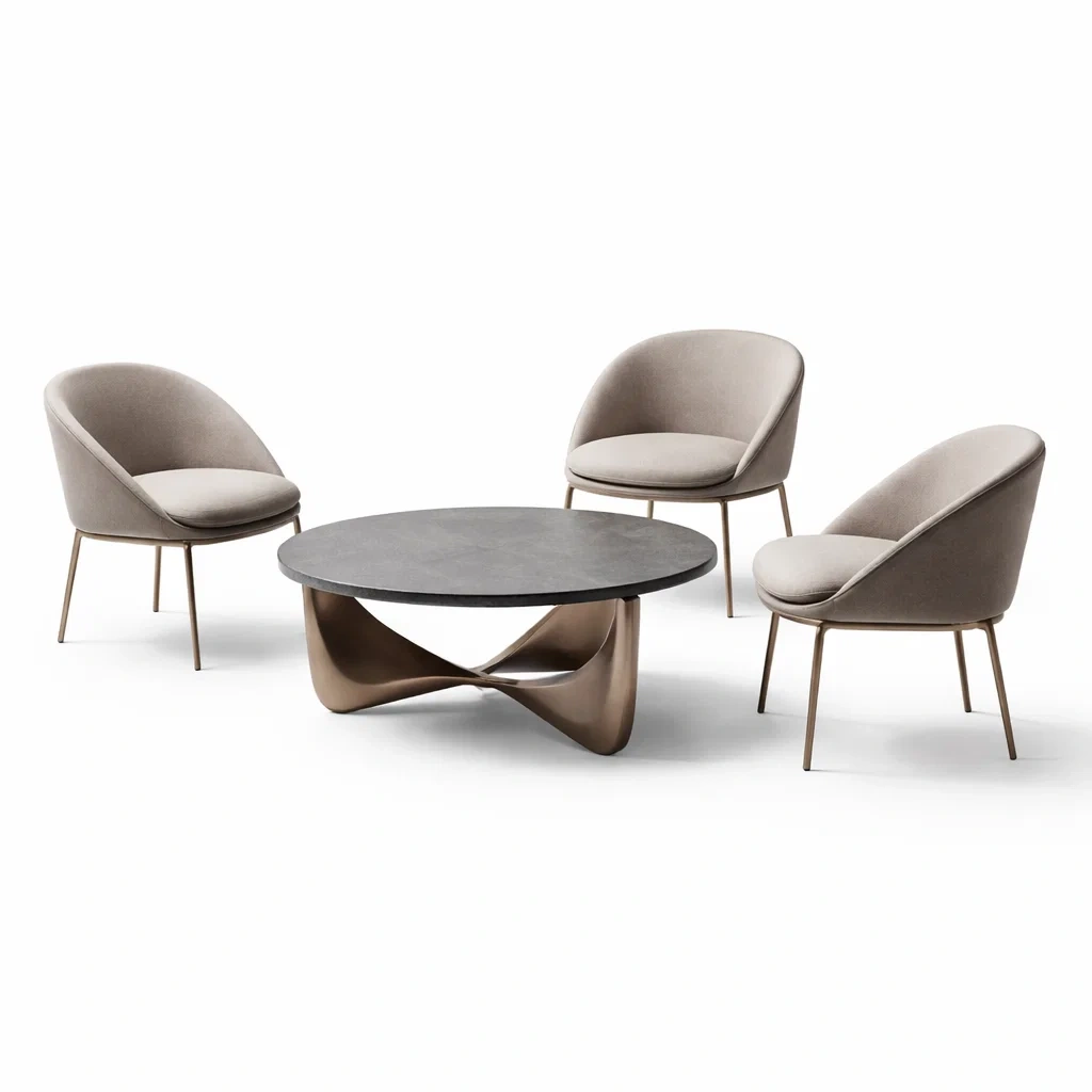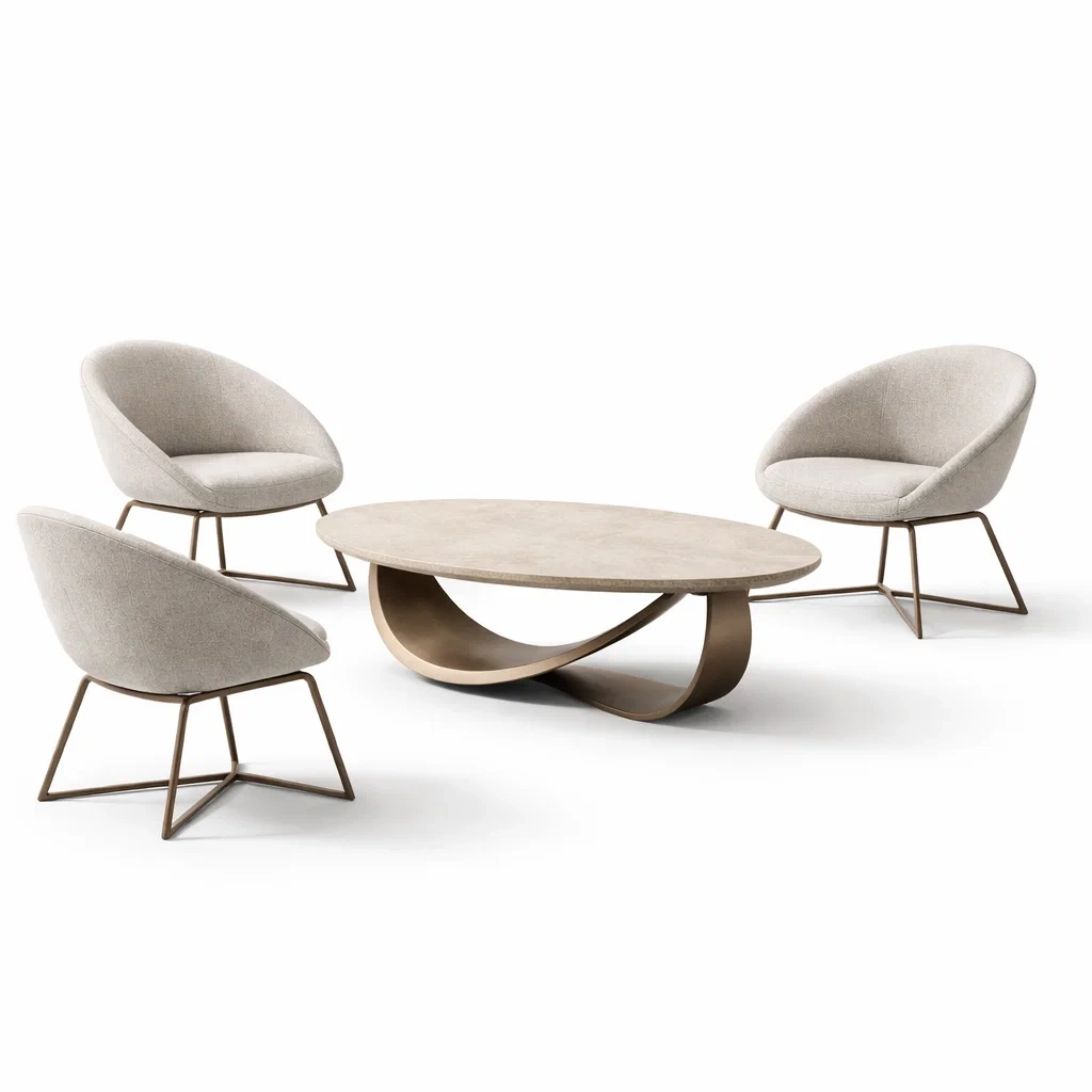 Set da conversazione con tavolino ovale e tre poltrone in tessuto beige e metallo