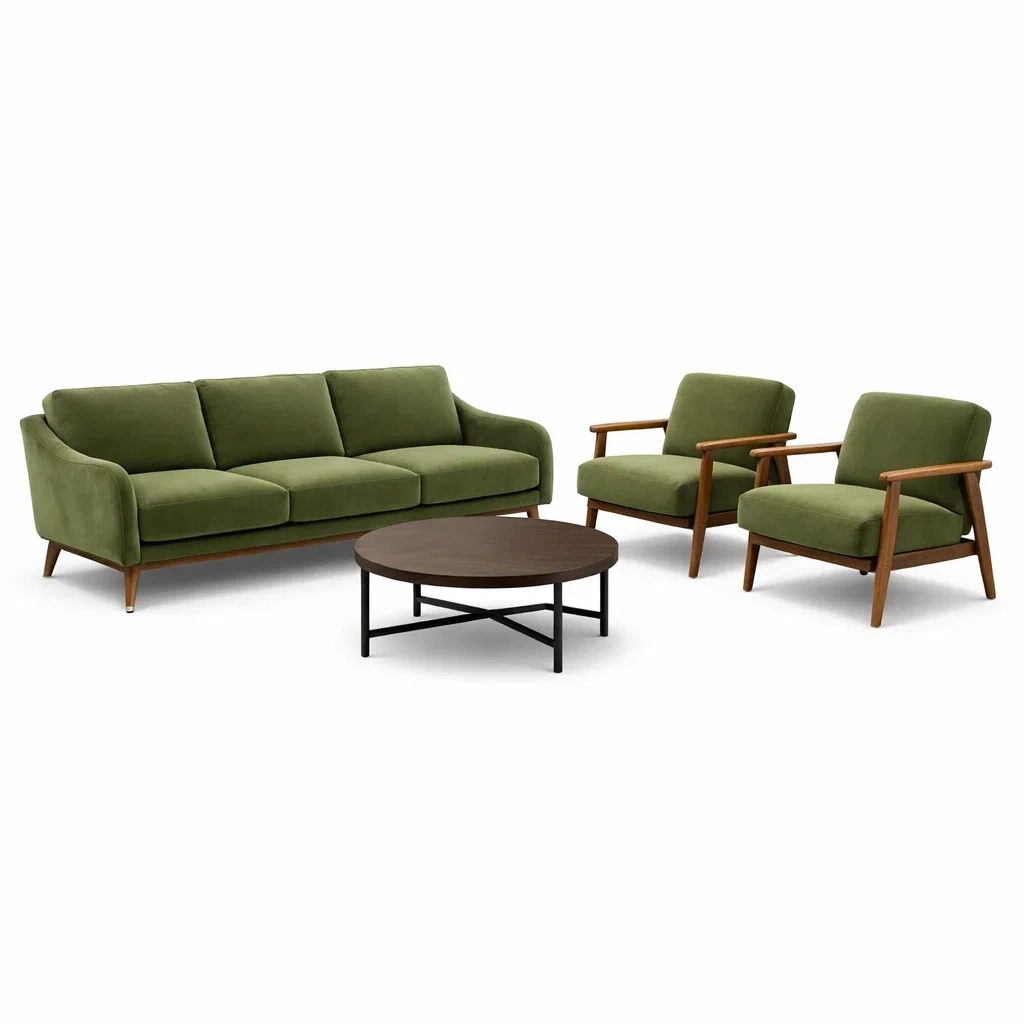 Il set salotto include un divano a 3 posti, due poltrone e un tavolino rotondo.